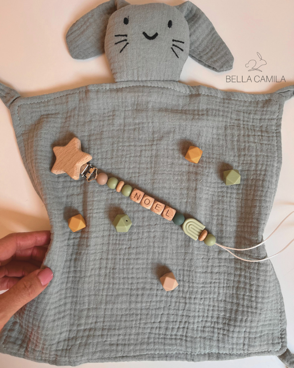 Halványzöld nyuszis szundikendő – természetes puhaság, amit minden baba imád