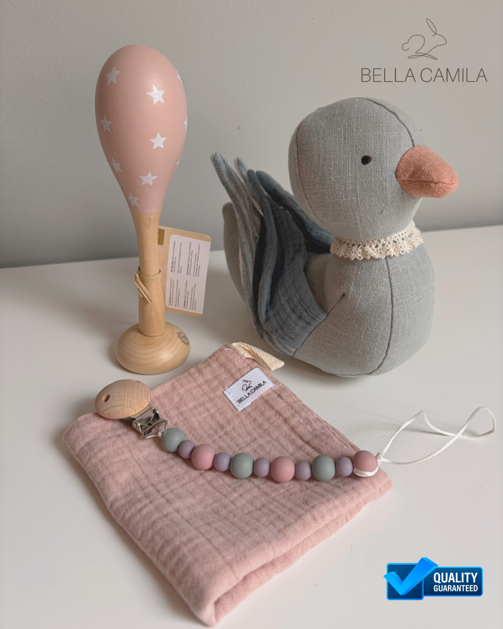 A Rosé babaköszöntő ajándék kollekció a Bella Camila bababolt egyik legkülönlegesebb válogatása. Ez a bájos, pasztell árnyalatú csomag nemcsak gyönyörű ajándék, hanem valóban hasznos és praktikus összeállítás is, amely tökéletes választás babaváró bulira, babalátogatásra vagy akár keresztelőre. Az összeállítás minden eleme bababarát, prémium anyagból készült, így garantáltan biztonságos és kényelmes a kisbabák számára.