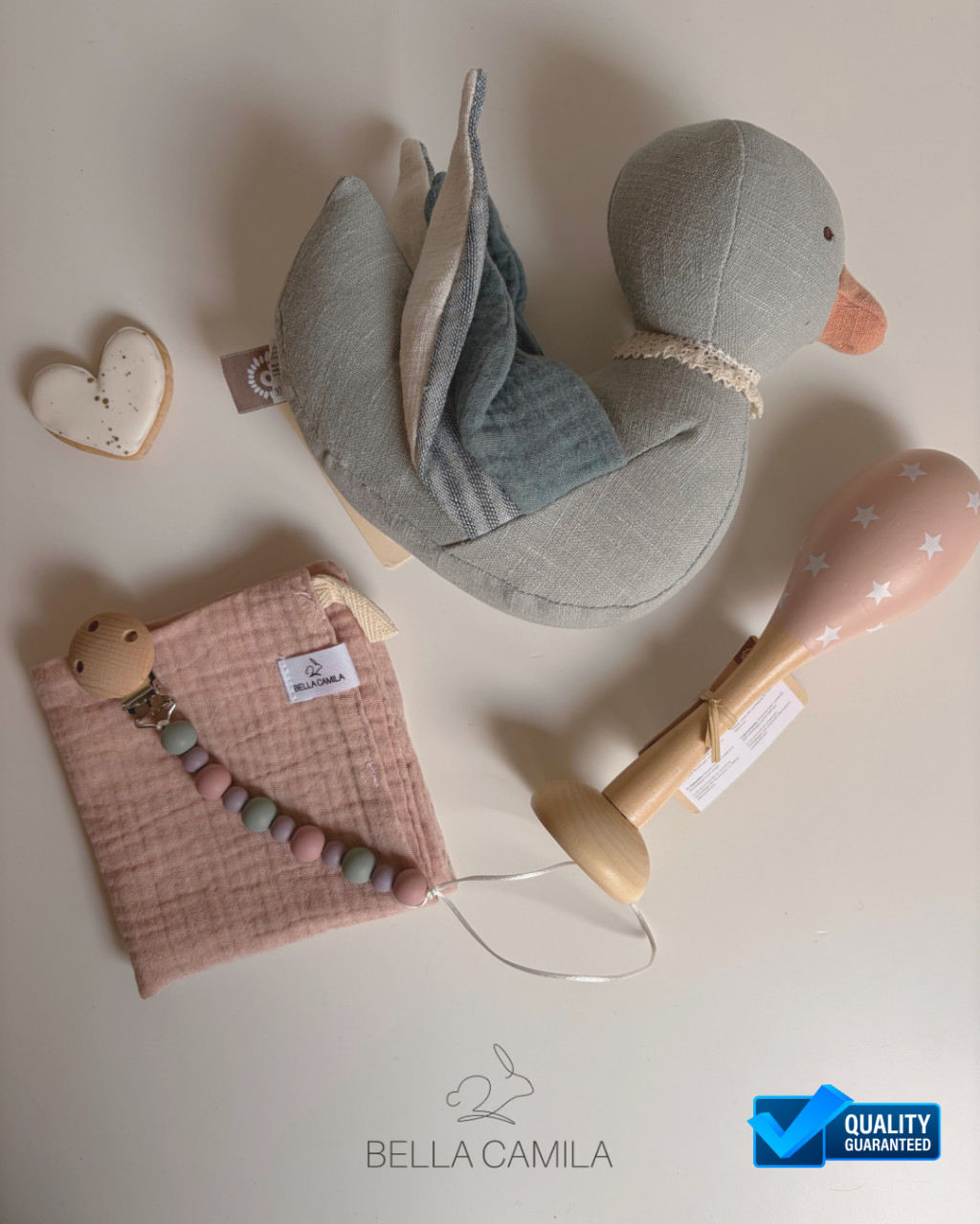 - Meseszép lenvászonból készült kacsa (18 cm), amely kedves kis társa lesz babádnak