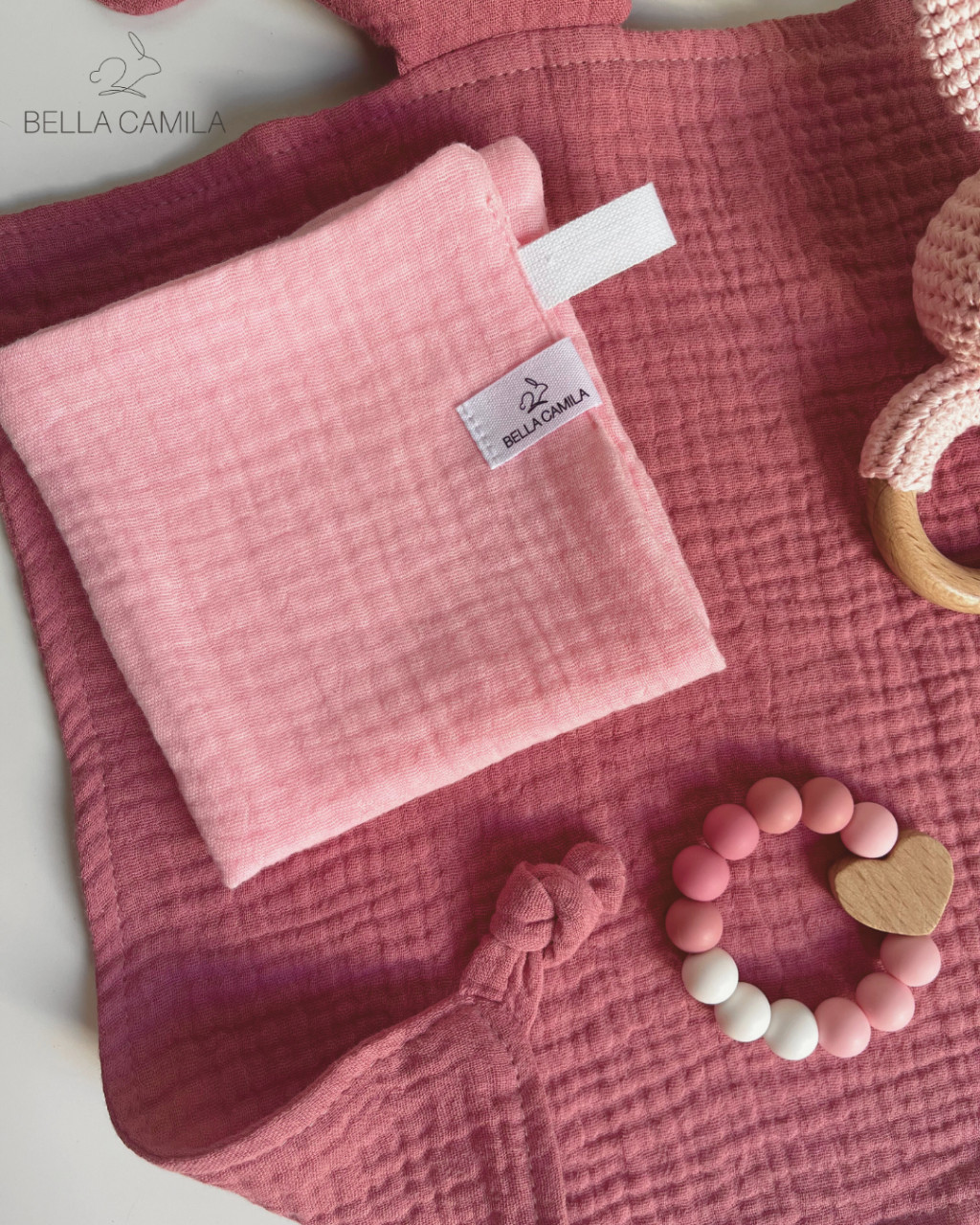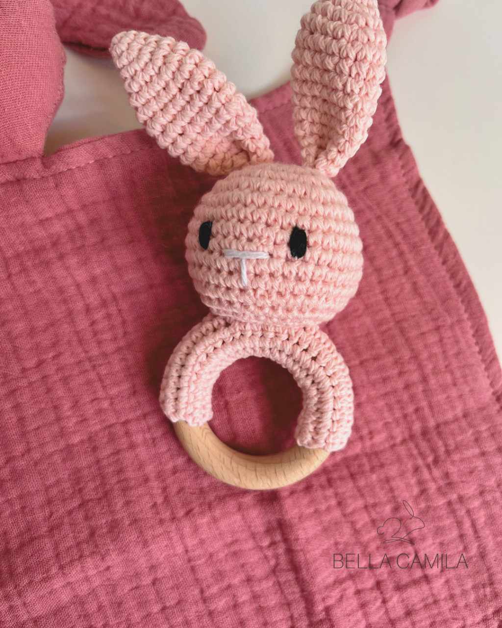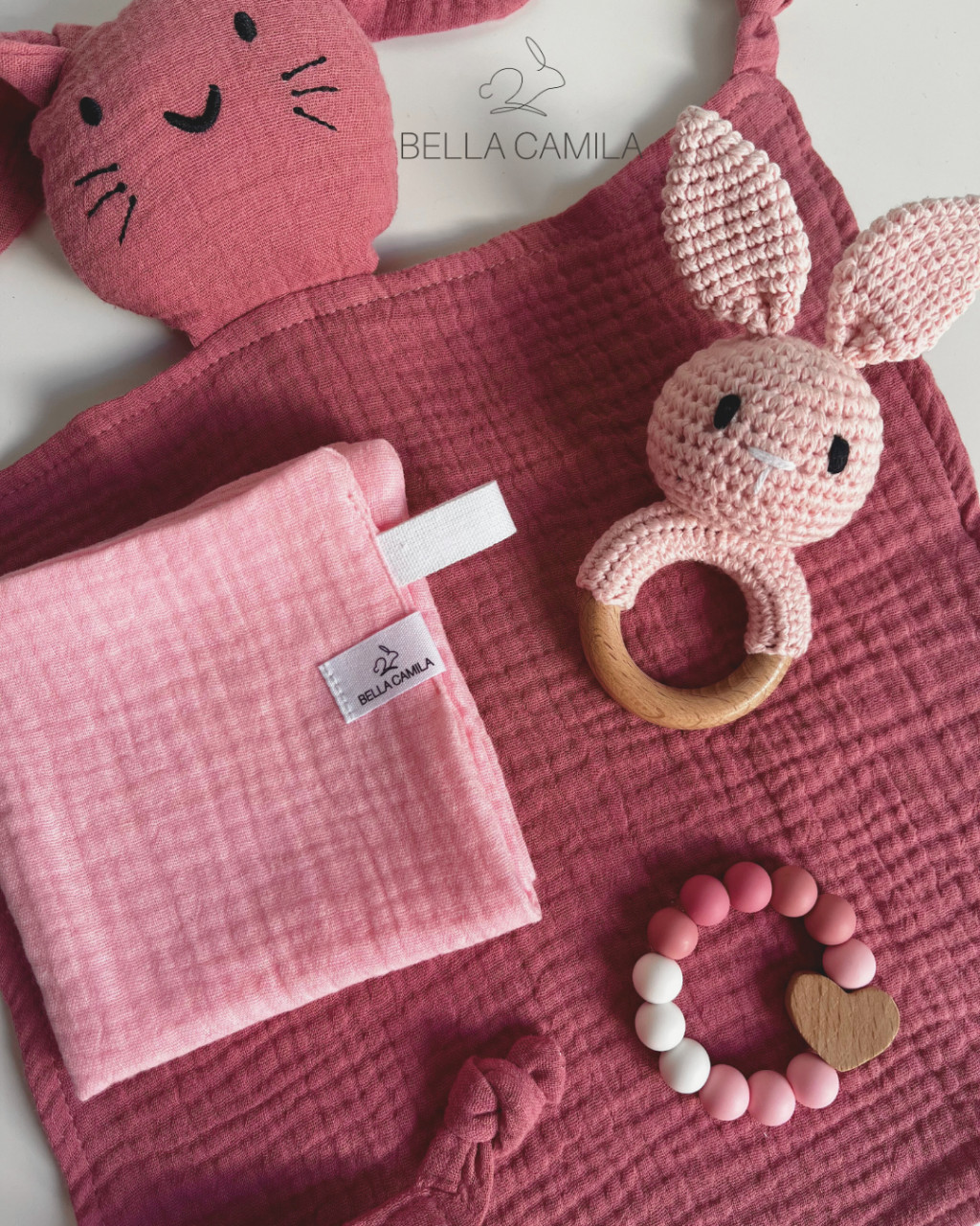 A Bella Camila bababolt kínálatában ez a szett igazi gyöngyszem – tökéletes választás babalátogató ajándék gyanánt vagy akár babaváró játékok közé is. A puha nyuszis szundikendő, a szivecskés rágóka, a kézzel horgolt csörgő és a praktikus minikendő együtt olyan ajándékcsomagot alkotnak, amely minden szülő szívét megdobogtatja.